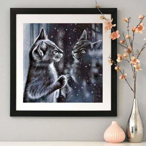 Full Drill - 5D DIY Diamond Painting Kits Winter Black And White Cat In Mirror